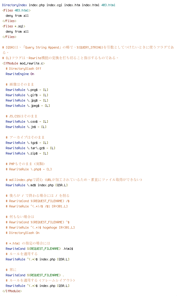 # [QSA]は、「Query String Append」の略で、%{QUERY_STRING}を引数としてつけたいときに使うフラグである。